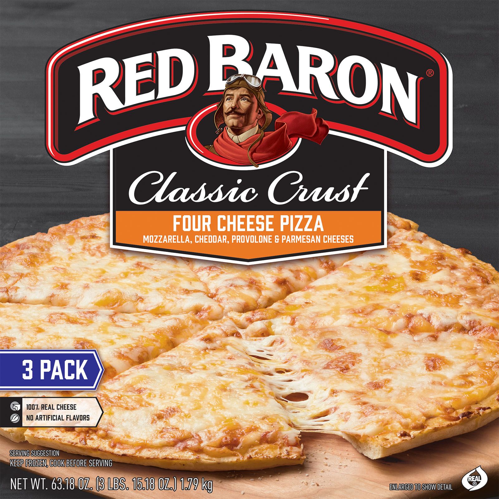 Red baron classic crust four cheese pizza is made with zesty tomato sauce and 100% real mozzarella, cheddar, provolone, and parmesan cheese.